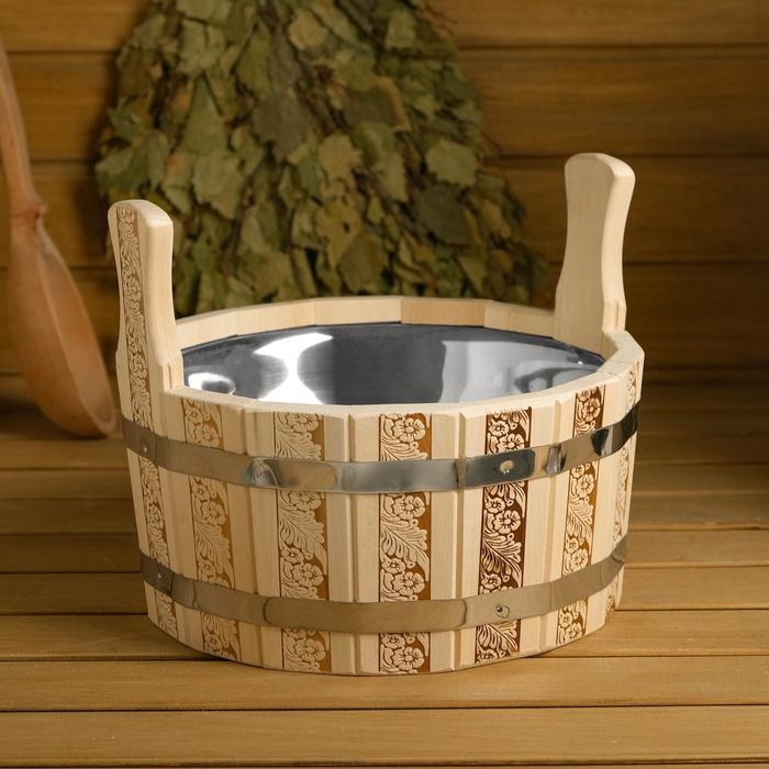 Шайка-таз из липы, 6 л, нержавеющая вставка, "Русские узоры"
