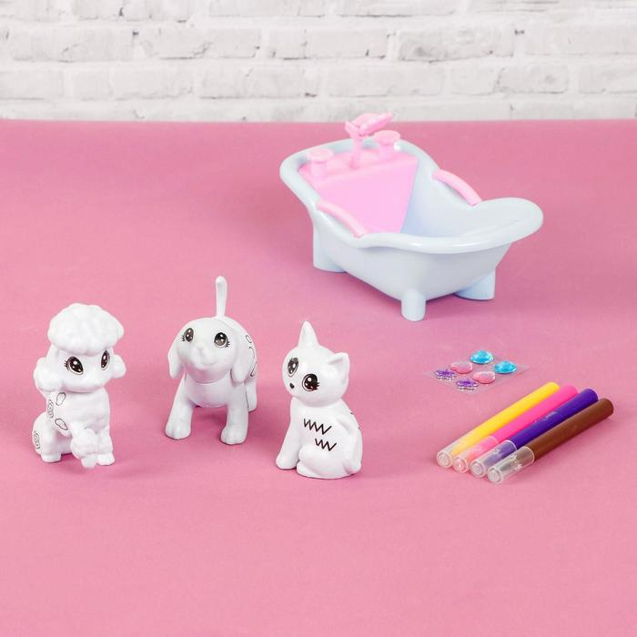С набором юные художники смогут расписать фигурки кошечки и зайчика на свой вкус! В комплект входит всё необходимое для раскрашивания. После того, как ребёнок изготовит зверюшек, с ними можно будет играть, а затем смывать и раскрашивать по-новому!
