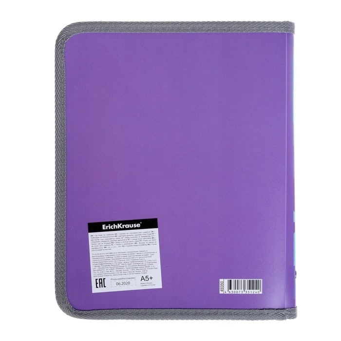 Папка на молнии формата A5+ из высококачественного пластика с текстурой поверхности "песок", на которой не видно отпечатков пальцев и мелких царапин.