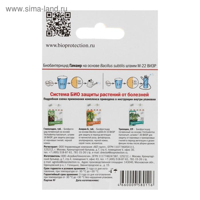 Гамаир, таб - биологический бактерицид на основе природной бактерии Bacillus subtilis М – 22 ВИЗР, предотвращающий пятнистости на листьях, бактериальные гнили, паршу, монилиоз, бактериальный рак, сосудистый и слизистый бактериозы.