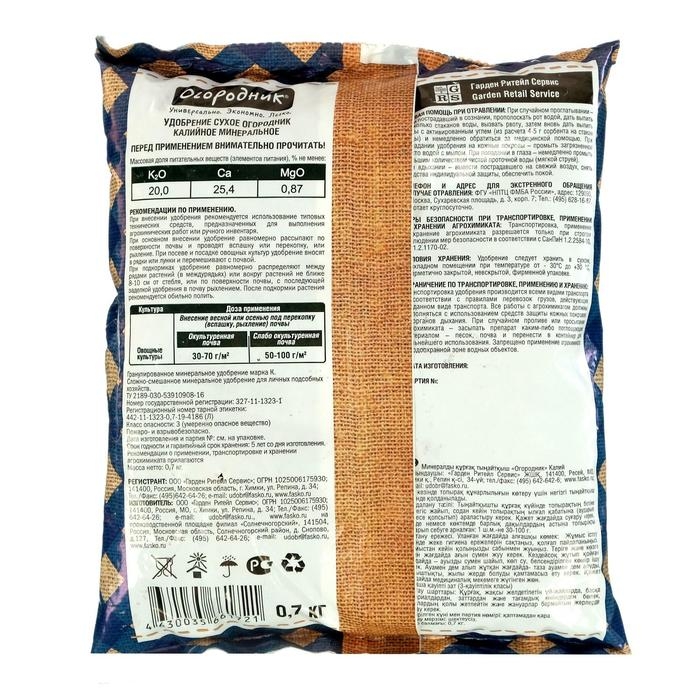 Удобрение сухое "Калийное" минеральное гранулированное, Огородник, 0,7 кг