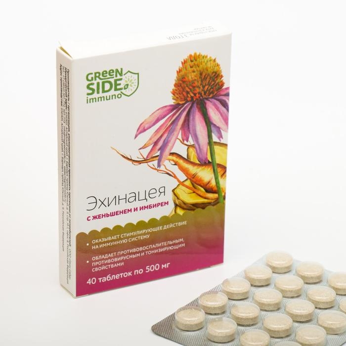 Эхинацея с женьшенем и имбирем, противовоспалительное, противовирусное и тонизирующее действие, 40 таблеток по 500 мг