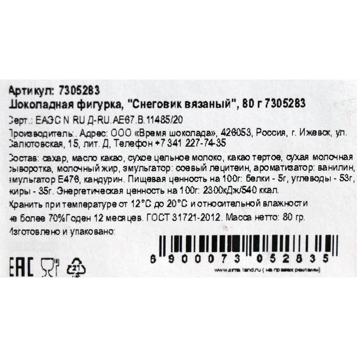 Шоколадная фигурка "Снеговик вязаный", 80 г
