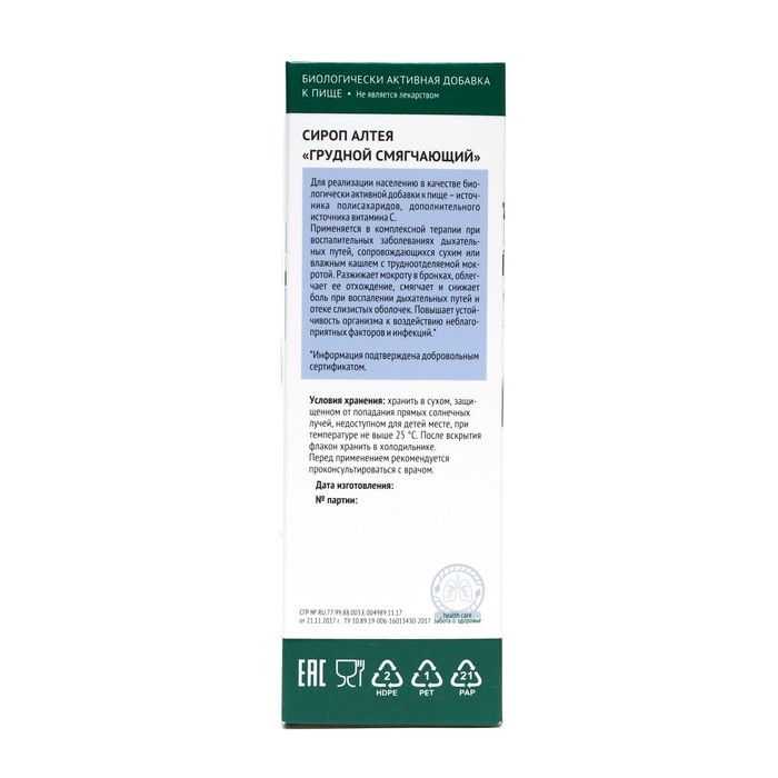 Биологически активная добавка к пище «Сироп Алтея «Грудной смягчающий» применяется в комплексной терапии при воспалительных заболеваниях дыхательных путей, сопровождающихся сухим или влажным кашлем с трудноотделяемой мокротой. Разжижает мокроту в бронхах, облегчает ее отхождение, смягчает и снижает боль при воспалении дыхательных путей и отеке слизистых оболочек. Повышает устойчивость организма к воздействию неблагоприятных факторов и инфекций.