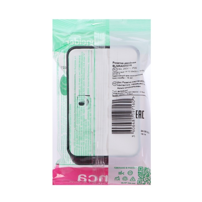 Розетка двойная SE Blanca, 16 А, 250 В, накладная, без з/к, IP20, антрацит, BLNRA000216