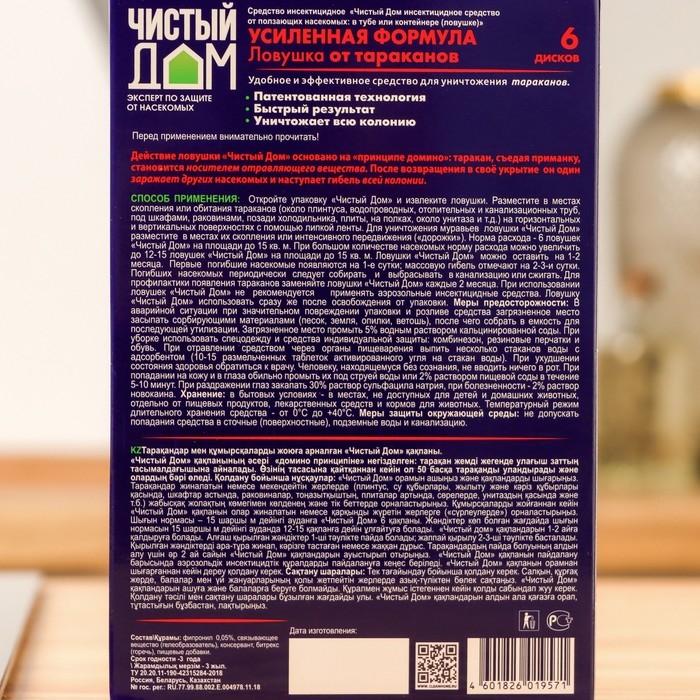 Принцип действия: Действие ловушки Чистый дом основано на «принципе домино»: таракан, съедая приманку, становится носителем отравляющего вещества. После возвращения в свое укрытие он один заражает других насекомых и наступает гибель всей колонии.