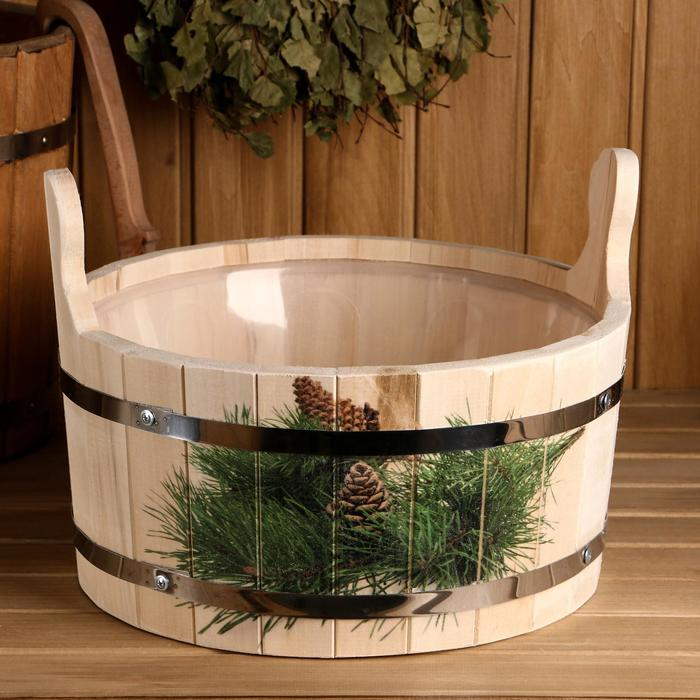 Шайка-таз из липы, 10 л, двуручная, пластиковая вставка, нержавеющий обруч, "Еловая ветка"