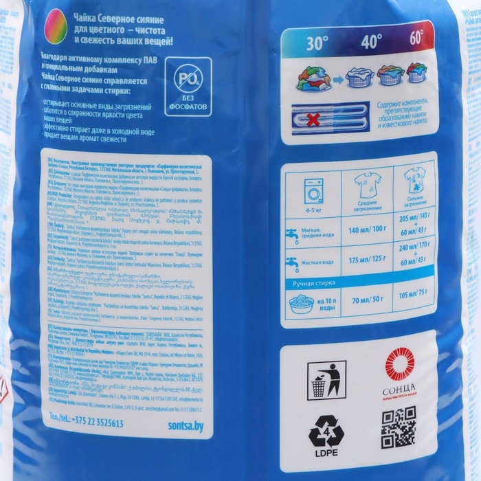 Способ применения: 150 г порошка на 4-5 кг белья, для ручной стирки 75 г порошка на 10 л воды.