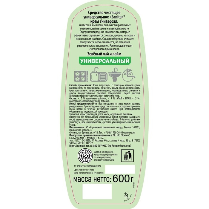 Средство чистящее универсальное с ароматом зеленый чай и лайм. Универсальный крем для очистки различных поверхностей на кухне и в ванной комнате. Сдержит природные компоненты, которые эффективно справляются с жиром, грязью, нагаром и известковым налётом, средство бережно очищает поверхности, легко смывается, не оставляет разводов после высыхания. Рекомендовано для ежедневного применения.