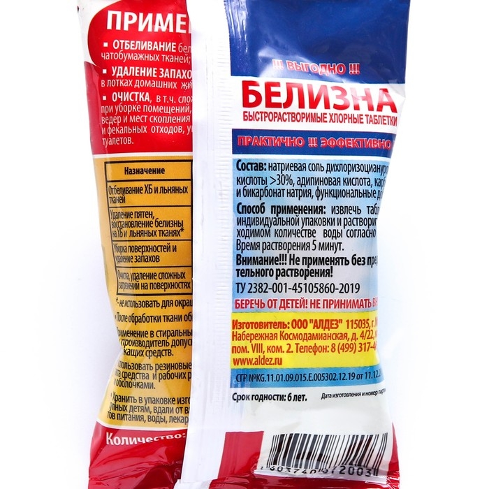 Белизна в таблетках, или как принято говорить хлорные таблетки - это дезинфицирующее средство для бассейна, уборки помещений, а также средство для стирки и очищения белого белья, отличный пятновыводитель. Таблетки применяют для очистки и дезинфекции воды в бассейнах; для стирки и отбеливания белых изделий, хлопчато-бумажных тканей; удаления неприятных запахов, в том числе в лотках домашних животных; очистке, в т.ч. сложных пятен и загрязнений; для дезинфекции мусорных ведёр, чистки унитазов и дачных туалетов. Дадим отпор микробам, неприятным запахам и пятнам!