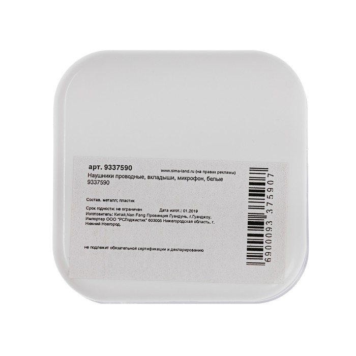 Наушники проводные, вкладыши, микрофон, белые