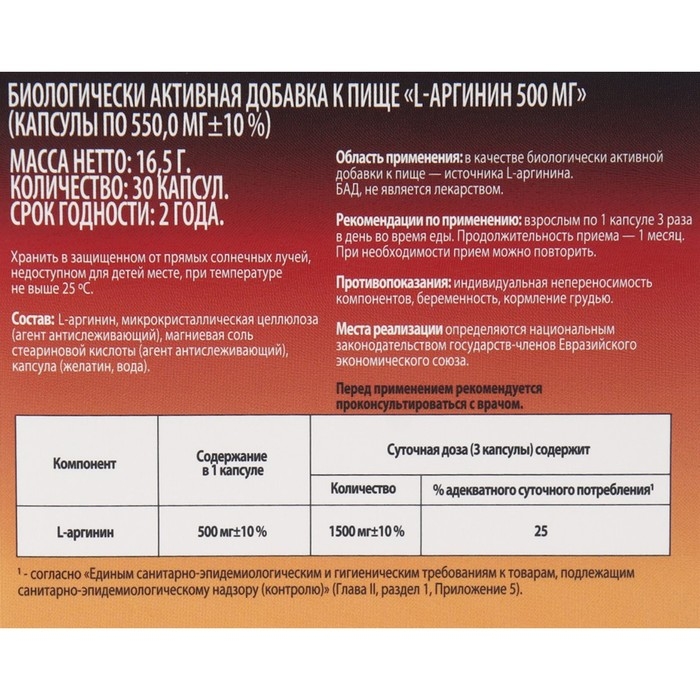 L-аргинин 500 мг (±10 %) 1500 мг (±10 %) 25