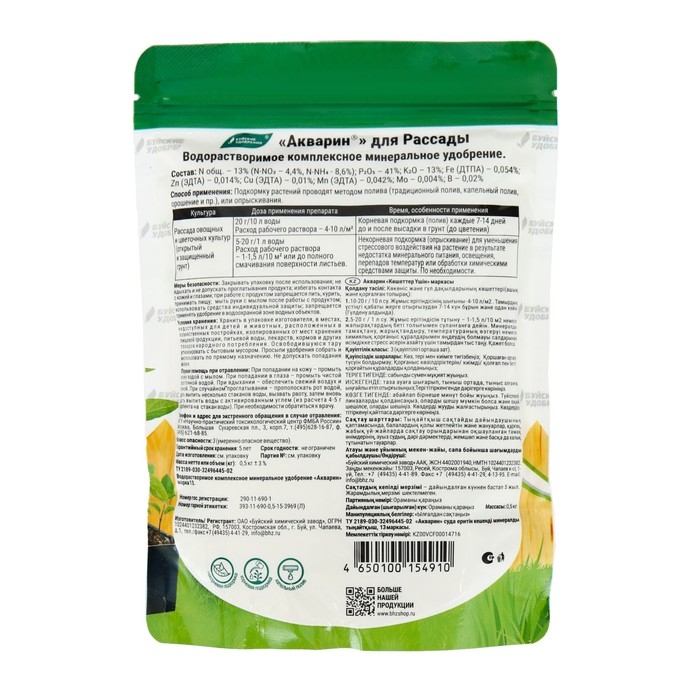 Удобрение предназначено для корневых и листовых подкормок овощных, плодовых и декоративных культур от рассады до начало цветения.