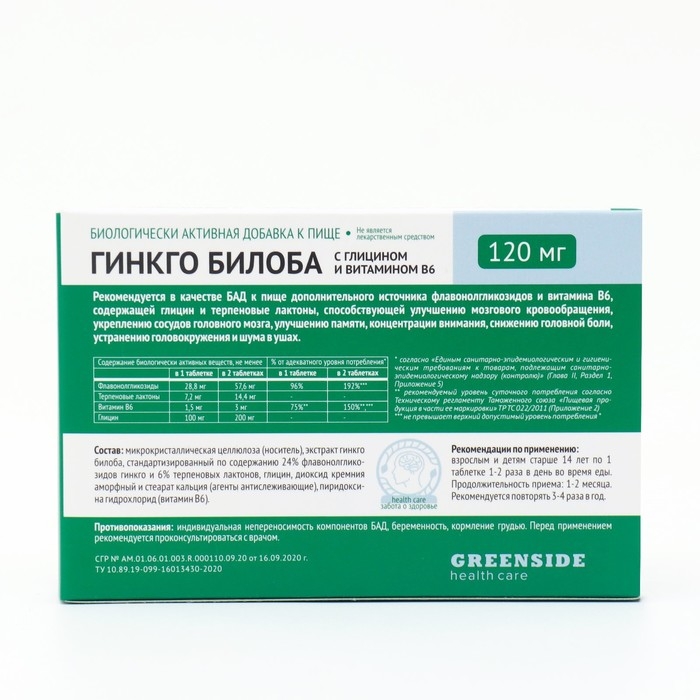 Гинкго билоба 120 мг с глицином и витамином В6, 60 таблетки, 500 мг