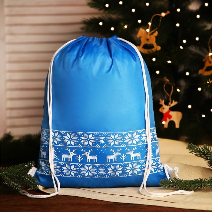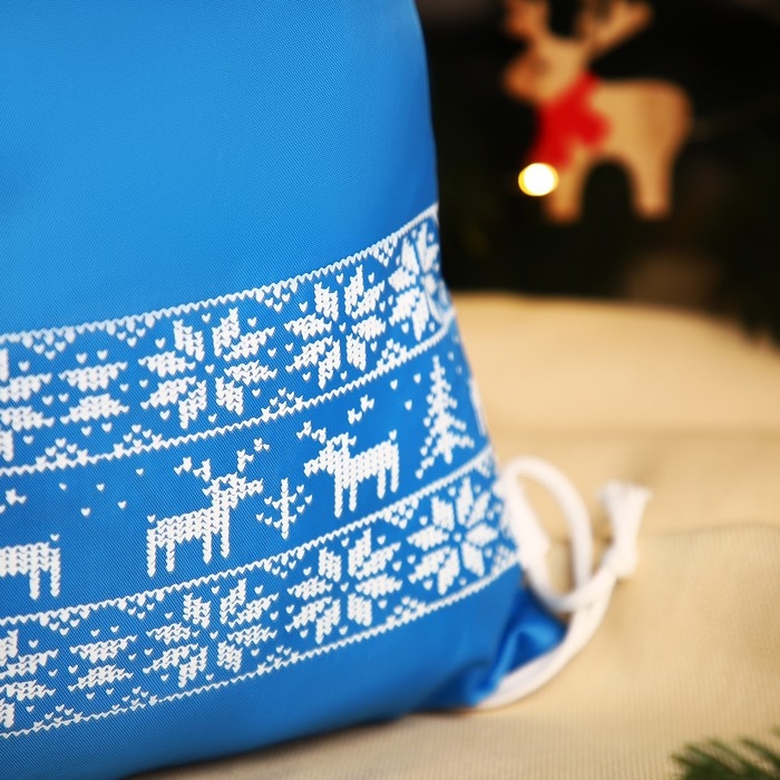 Новый год 2025. Новогодний мешок для подарков на шнурке "Олени", цвет голубой