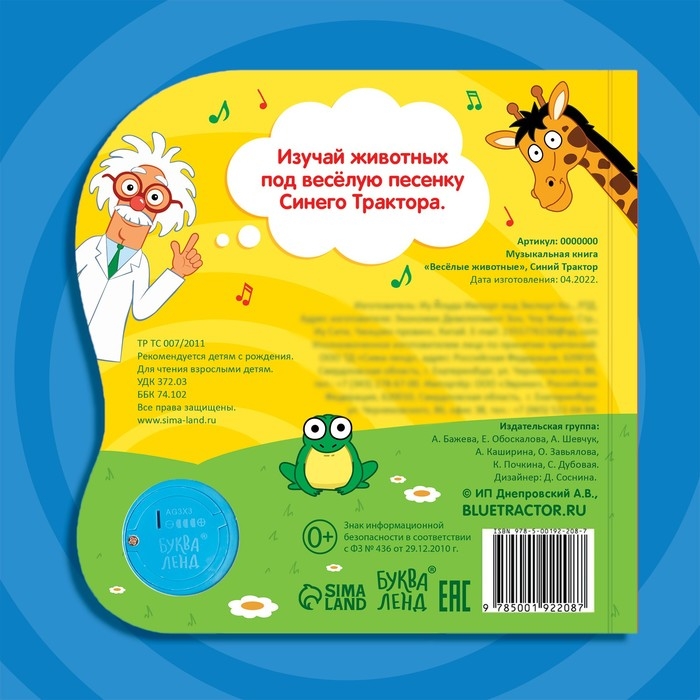 Картонная книга с музыкальным чипом «Весёлые животные», 10 стр., Синий трактор
