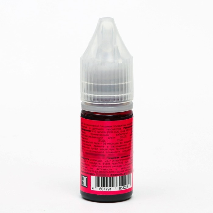 Рекомендуемая дозировка: 5 — 10 капель красителя на 100 грамм продукта; 0,10 — 0,20 грамм на 100 грамм продукта; 0,10 — 0,20 % от массы продукта. Перед применением взболтать!