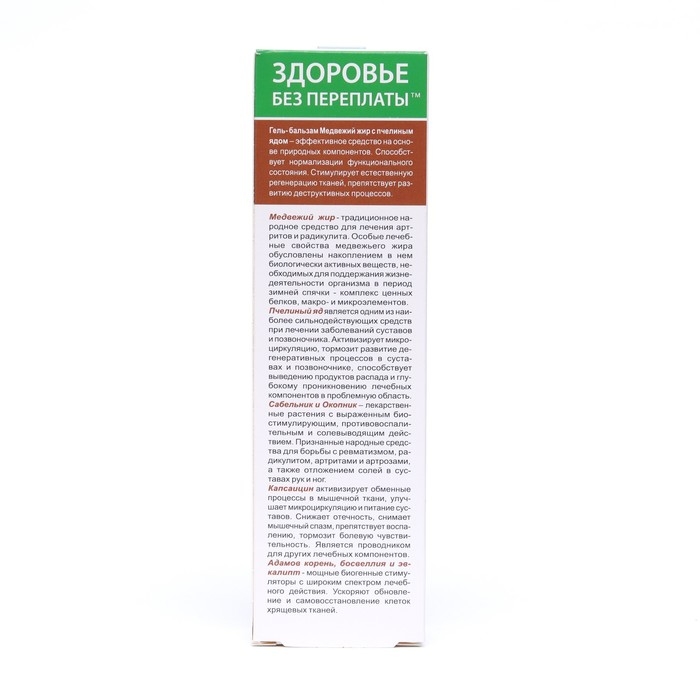 Пчелиный яд - продукт секреторной деятельности ядовитых желез медоносных пчёл, высокоэффективное натуральное средство для лечения заболеваний суставов и позвоночника. Содержит белковые вещества, липиды, биогенные амины, ортофосфорную и нуклеиновую кислоты, комплекс ценных микро- и макроэлементов. Обладает выраженным противовоспалительным, разогревающим, обезболивающим, бактерицидным, иммунокорректирующим действием, активизирует кровоток, улучшает обмен веществ в суставе и питание суставных тканей. Стимулирует регенерацию костной и хрящевой ткани при заболеваниях суставов, улучшает качество синовиальной жидкости, заживляет суставные микро травмы, ускоряет сращивание костей при переломах. Корни содержат рекордное количество аллантоина, полисахариды, алкалоиды,гликозиды, полифенолы, тритерпеновые сапонины, фитостерины, танины,кумарины, органические кислоты.