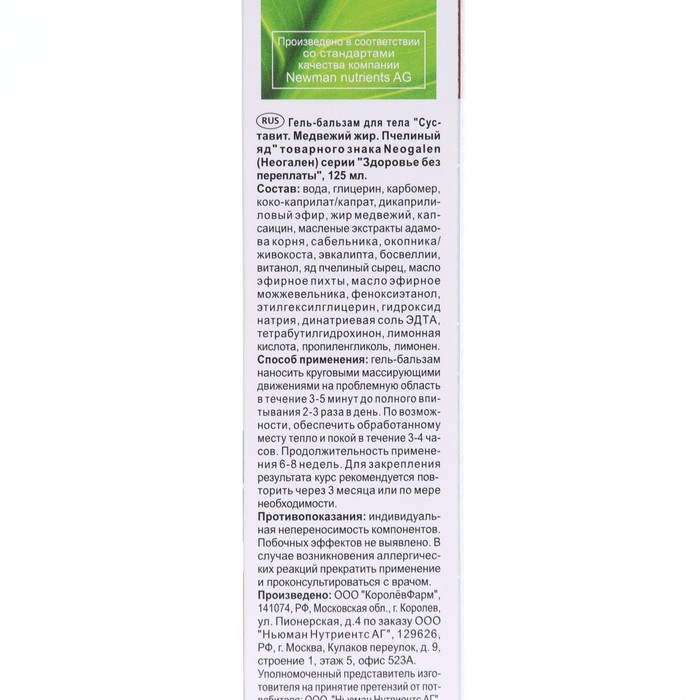 Состав: вода, глицерин, карбомер, коко-каприлат/капрат, дикаприлиловый эфир, жир медвежий, капсаицин, масленые экстракты адамова корня, сабельника, окопника/живокоста, эвкалипта, босвеллии, витанол, яд пчелиный сырец, масло эфирное пихты, масло эфирное можжевельника, феноксиэтанол, этилгексилглицерин, гидроксид натрия, динатриевая соль ЭДТА, тетрабутилгидрохинон, лимонная кислота, пропиленгликоль, лимонен.