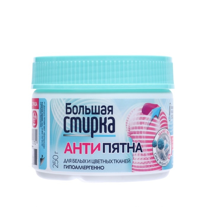 Пятновыводитель "Большая стирка" на основе активного кислорода предназначен для удаления пятен перед стиркой и во время стирки цветных изделий из всех видов тканей (кроме изделий из натуральных шелка и шерсти).