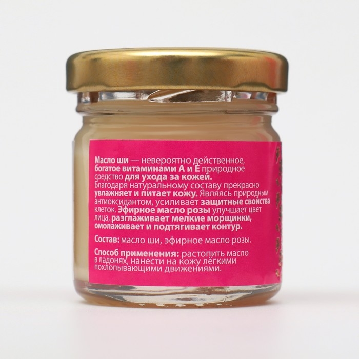 Масло ши — невероятно действенное, богатое витаминами А и Е природное средство для ухода за кожей. Благодаря натуральному составу прекрасно увлажняет и питает кожу. Являясь природным антиоксидантом, усиливает защитные свойства клеток. Эфирное масло розы улучшает цвет лица, разглаживает мелкие морщинки, омолаживает и подтягивает контур.