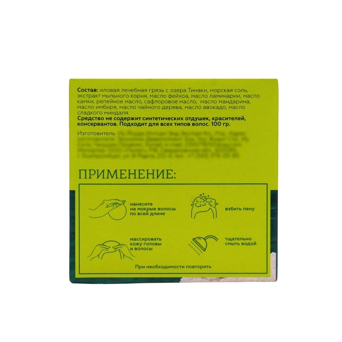 Состав: сульфидно-иловая лечебная грязь озера Тамбукан, масло какао, омыленная смесь оливкового, кокосового, касторового и масла миндальных косточек, масляный экстракткорней лопуха, мята, глицерин, натриевая соль кислот еловой живицы, масло жожоба, эфирное масло лаванды, эфирное масло чайного дерева, янтарная кислота, витамин Е.