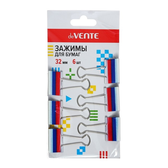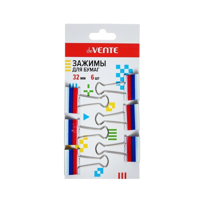 Зажим для бумаг "deVENTE. Триколор" металлический (32 мм) толщина скрепления до 13,5 мм, 6 шт на картонном блистере.