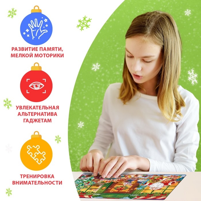Пазл с новогодним сюжетом — то, что нужно для полезного и интересного досуга! Такой подарок поможет ребёнку скрасить ожидание Нового года, а также потренировать мелкую моторику, внимательность, логическое мышление и память.