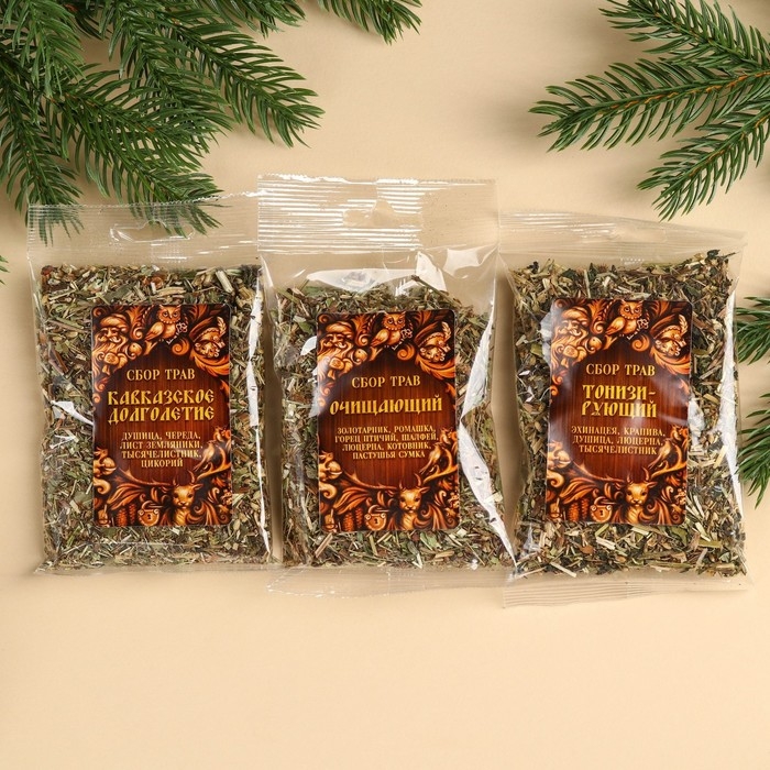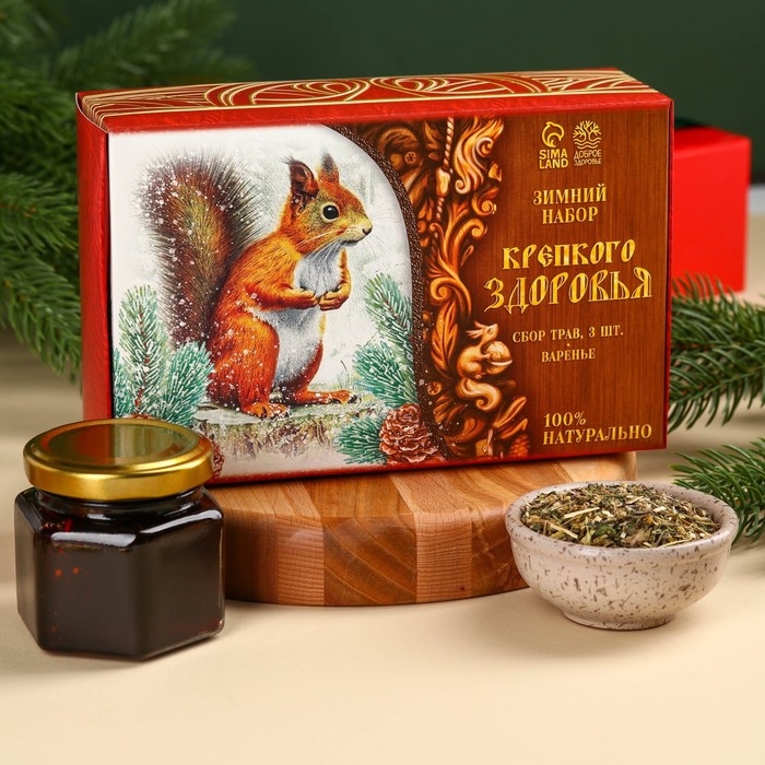 Подарочный набор «Крепкого здоровья»: три вида сбора трав 60 г ( 3 шт. х 20 г)., варенье из сосновых шишек 100 мл.