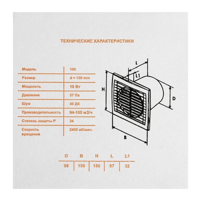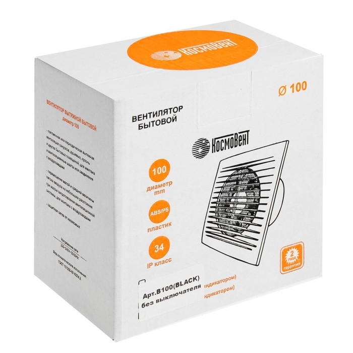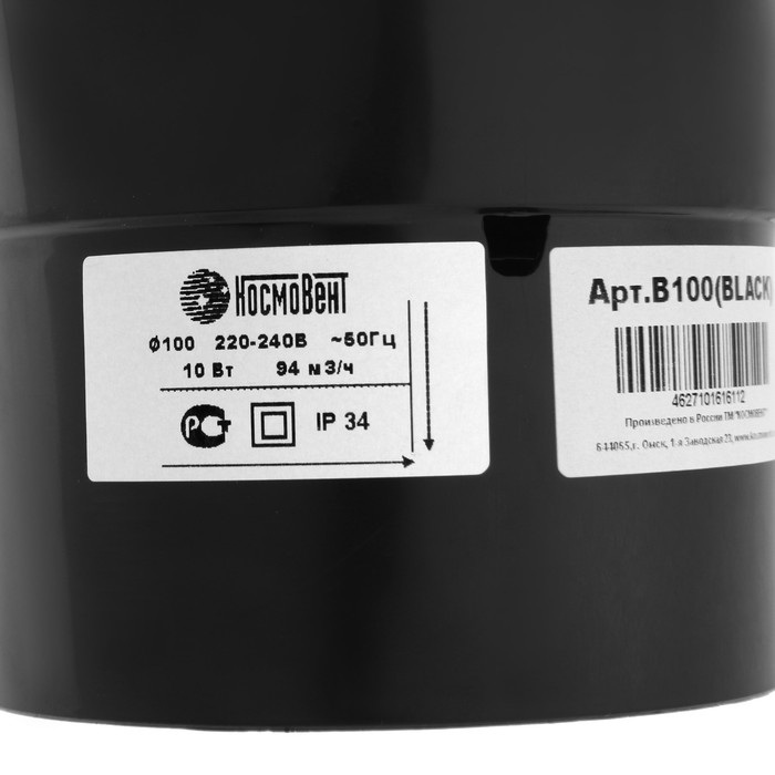 Вентилятор вытяжной "КосмоВент" В100, d=100 мм, 10 Вт, 40 дБ, 105 м³/ч, без выключ, черный