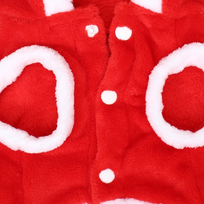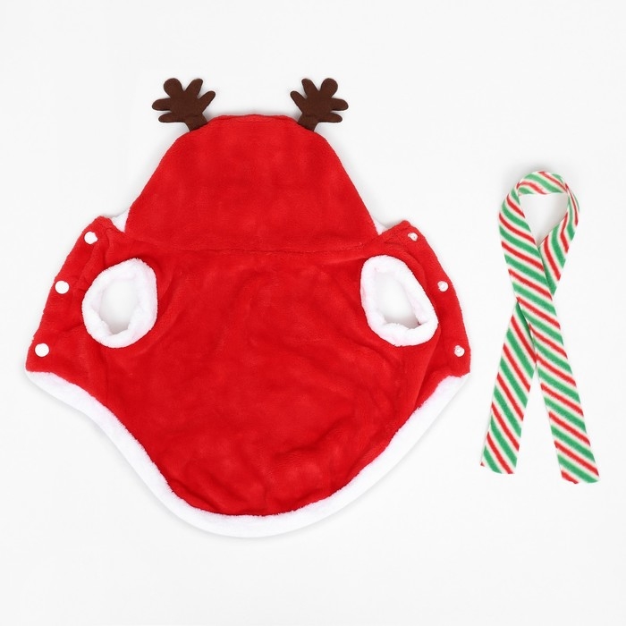 Костюм "Новогодний с рожками" из мягкого флиса с капюшоном, полосатым шарфиком и удобными клепками на животе - это чудесный праздничный наряд, который добавит волшебства и радости в жизнь вашего пушистого друга. Изготовлен из мягкого флиса, что позволяет надевать костюм в прохладную погоду или просто дома.