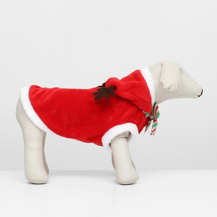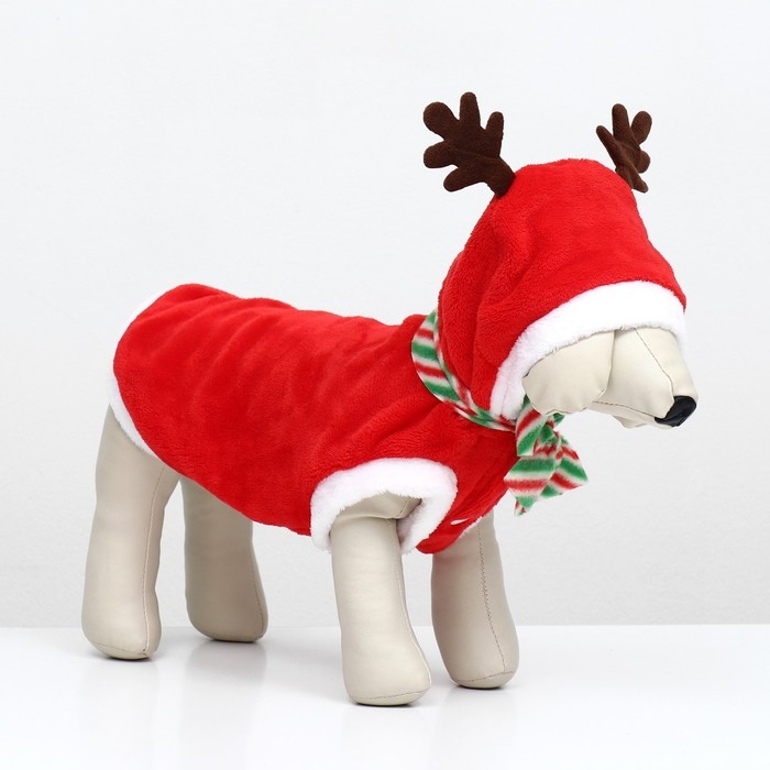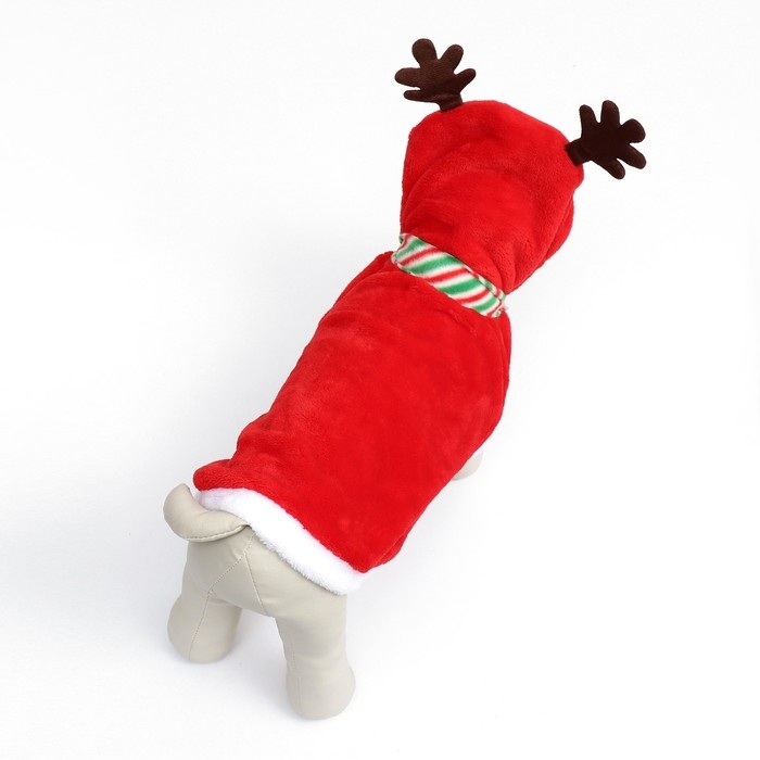 Костюм "Новогодний с рожками" из мягкого флиса с капюшоном, полосатым шарфиком и удобными клепками на животе - это чудесный праздничный наряд, который добавит волшебства и радости в жизнь вашего пушистого друга. Изготовлен из мягкого флиса, что позволяет надевать костюм в прохладную погоду или просто дома.