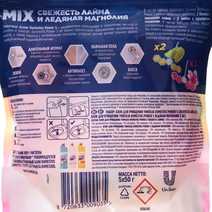 Попробуйте блоки для очищения туалета Domestos Свежесть лайма или Ледяная магнолия против известкового налета и неприятного запаха. Выбирайте аромат блоков Domestos Power 5 в зависимости от вашего настроения: сочный свежий лайм или нежная ледяная магнолия. Блок для очищения унитаза Доместос содержит активное вещество, которое смывает бактерии и борется с появлением известкового налета. Средство наполняет комнату ярким ароматом, который помогает предотвращать неприятные запахи и остается в течение длительного времени после смывания — до 4 часов. Вскройте пластиковый пакет по пунктирной линии и достаньте блок Свежесть лайма или Ледяная магнолия. Поместите его под ободок унитаза в место наиболее сильного потока воды с помощью держателя. По окончании использования блока Domestos Power 5 выбросите его в мусорное ведро и установите новый блок из упаковки. Храните оставшиеся блоки в закрытом пакете – так они дольше сохранят свои ароматы!