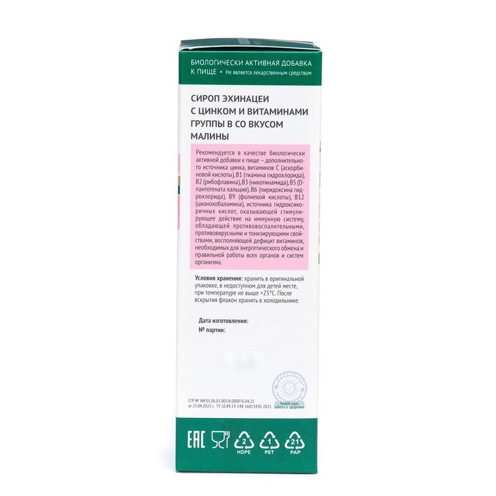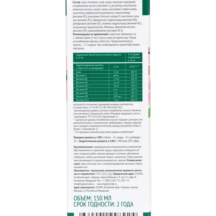 Сироп Эхинацеи с цинком и витаминами группы В со вкусом малины, 150 мл