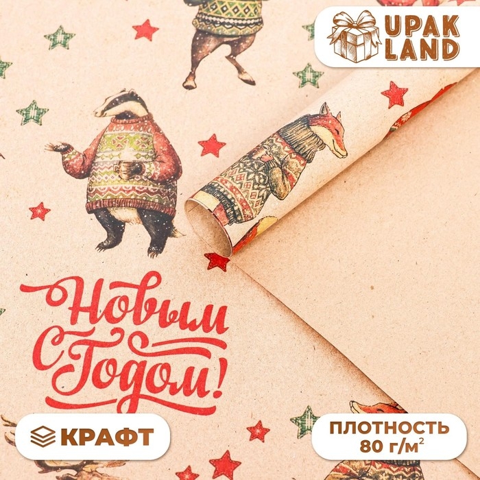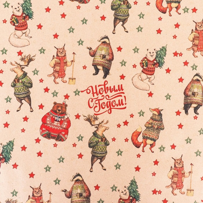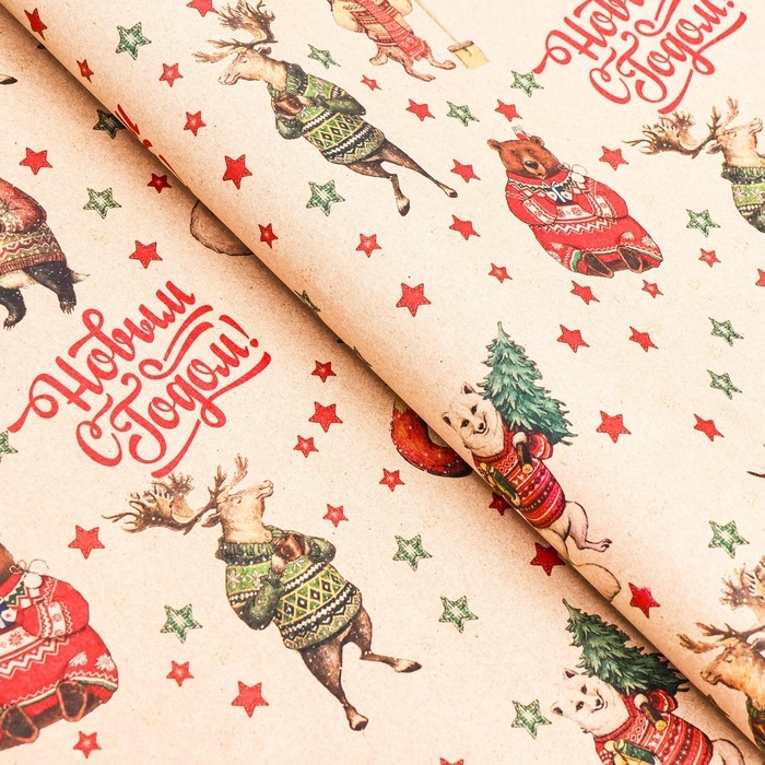 Новый год. Бумага упаковочная новогодняя крафт бурый " Жители", 70 х 100 см.