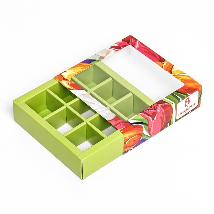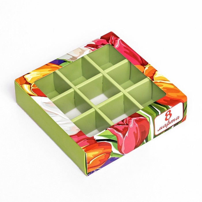 Коробка для 9 конфет с обечайкой , " 8 марта" 13,8 х 13,8 х 3,8. Кондитерская упаковка