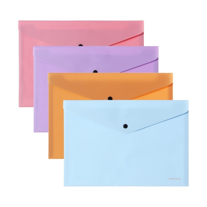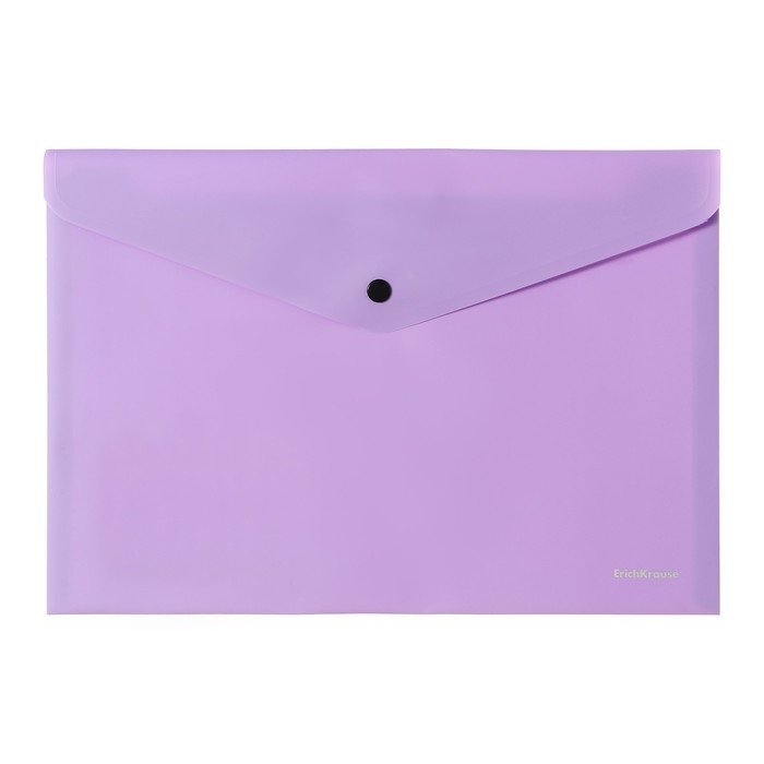 Папка-конверт на кнопке формата А4 из высококачественного непрозрачного пластика с текстурой поверхности "софт-тач", на которой не видно отпечатков пальцев и мелких царапин. Предназначена для хранения и транспортировки небольшого количества документов. Цвет папки - ассорти: бежевый, голубой, розовый, фиолетовый. Надежная застежка-кнопка обеспечивает быстрый доступ к документам. Папка вмещает до 120 бумажных листов. Размер - 232х333мм, толщина - 0.18мм. Код и баркод на каждой единице товара