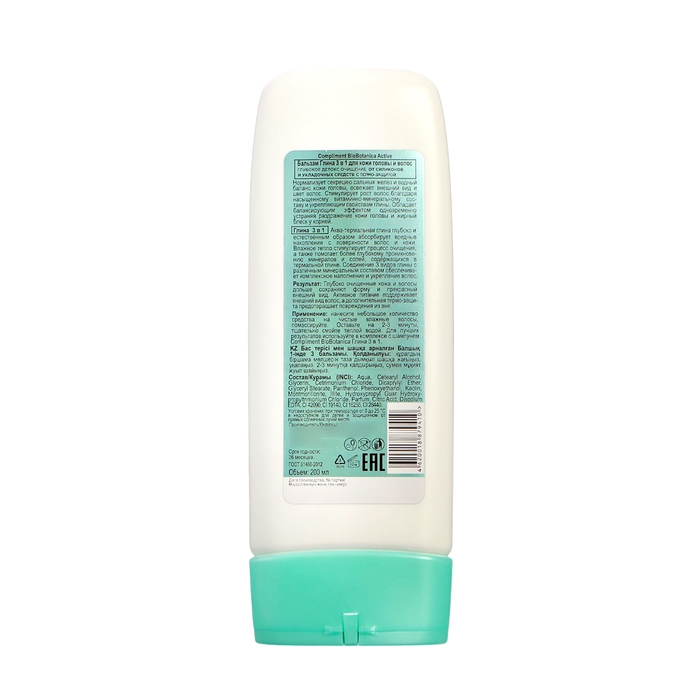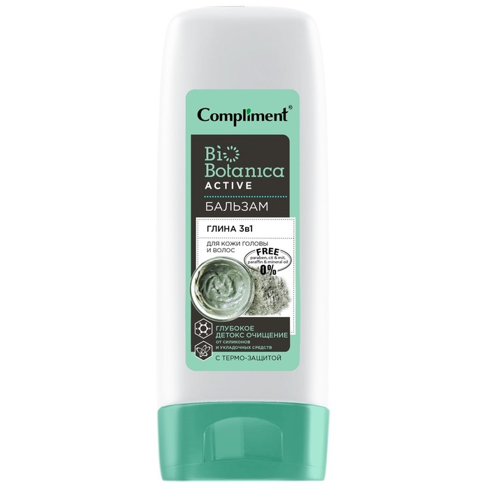Способ применения: нанесите небольшое количество средства на чистые влажные волосы, помассируйте. Оставьте на 2-3 минуты, тщательно смойте теплой водой. Для лучших результатов используйте в комплексе с шампунем Compliment BioBotanica Глина 3 в 1.