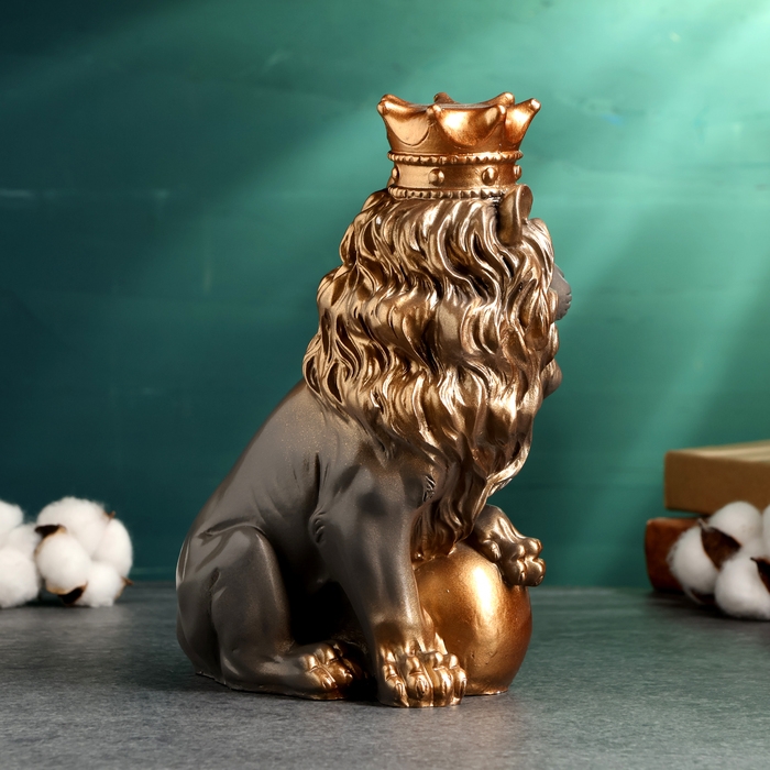 Копилка "Лев с короной и шаром сидит" серый с бронзой, 23см