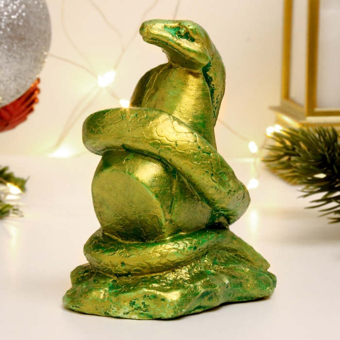 Новый год. Символ 2025. Фигура "Змея на камне" зеленый с позолотой, 9х7х5см