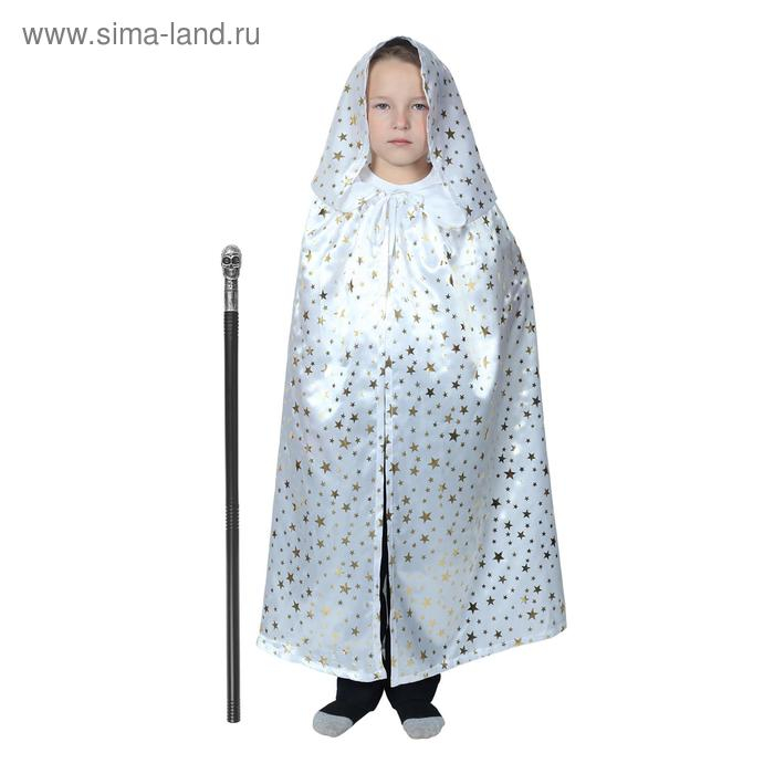 Карнавальный плащ белый со звёздами, с капюшоном, длина 85 см, палка мага