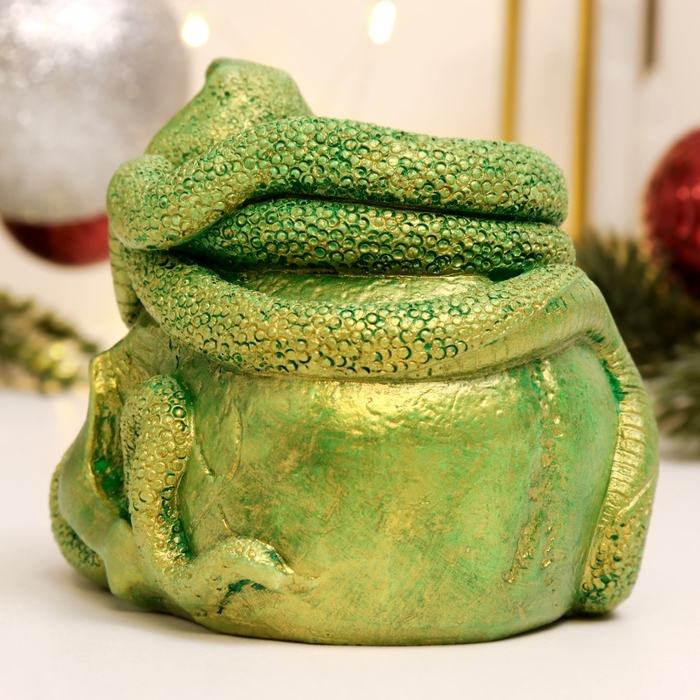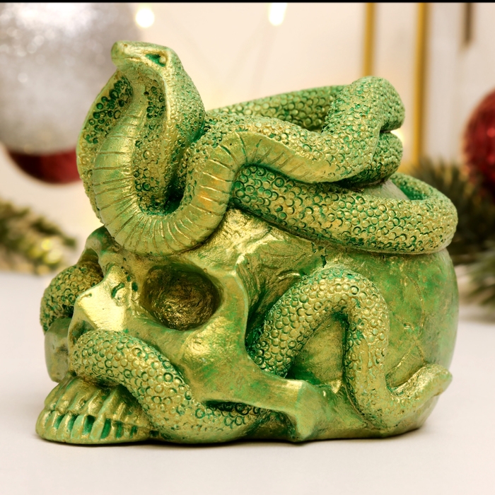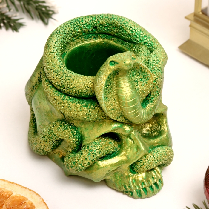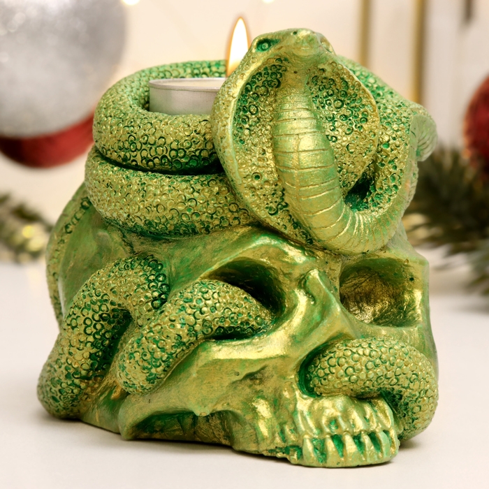 Новый год. Символ 2025. Подсвечник "Змея на черепе" зеленый с позолотой, 11х10х8см