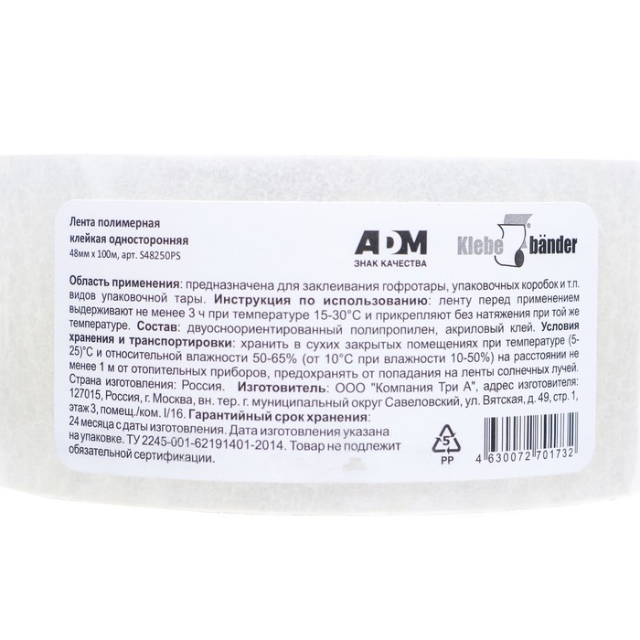 Ширина ленты составляет 48 мм, а длина - 100 метров. Толщина ленты составляет 40 мкм, что обеспечивает достаточную прочность для большинства задач упаковки.