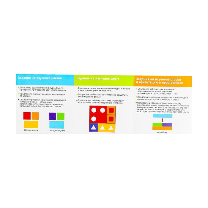 Внутри вы найдёте задания для изучения форм, цветов, а также сторон и ориентации в пространстве.