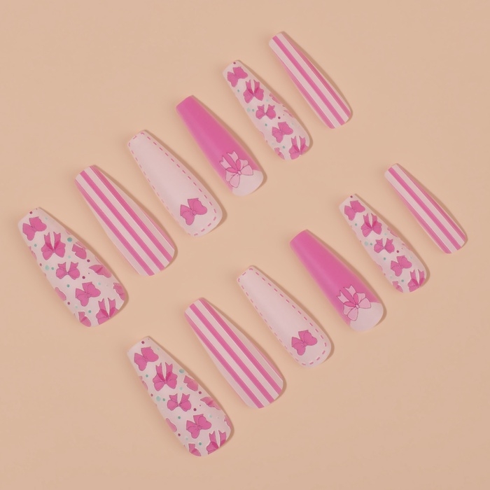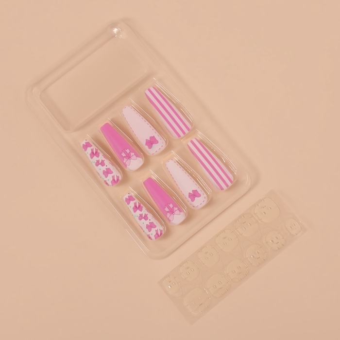 Накладные ногти «Бантики», 12 шт, с клеевыми пластинами, форма балерина, цвет белый/розовый