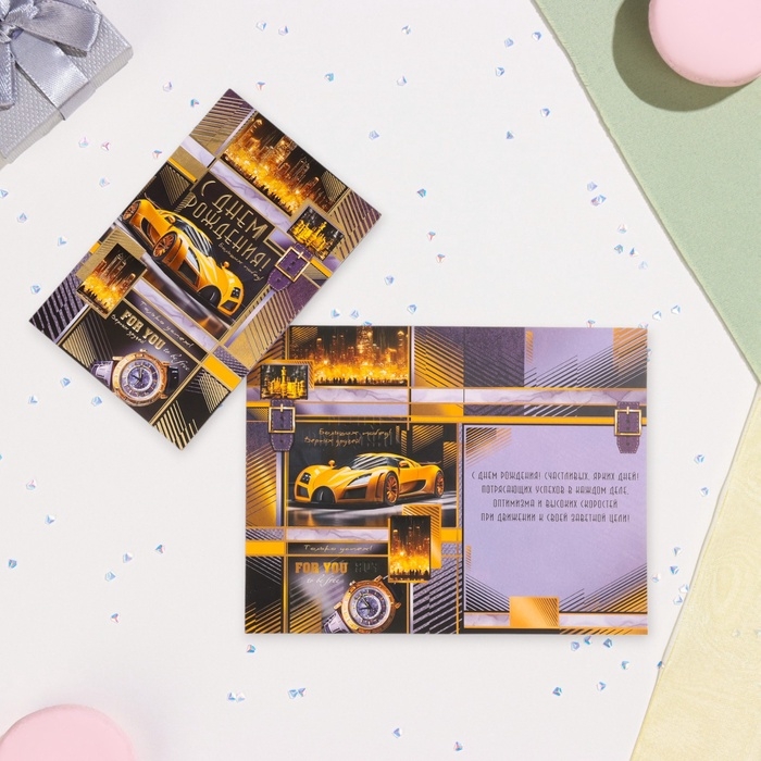 Открытка "С Днём Рождения!" конгрев, тиснение, жёлтый автомобиль, 12,5 х 19,4 см