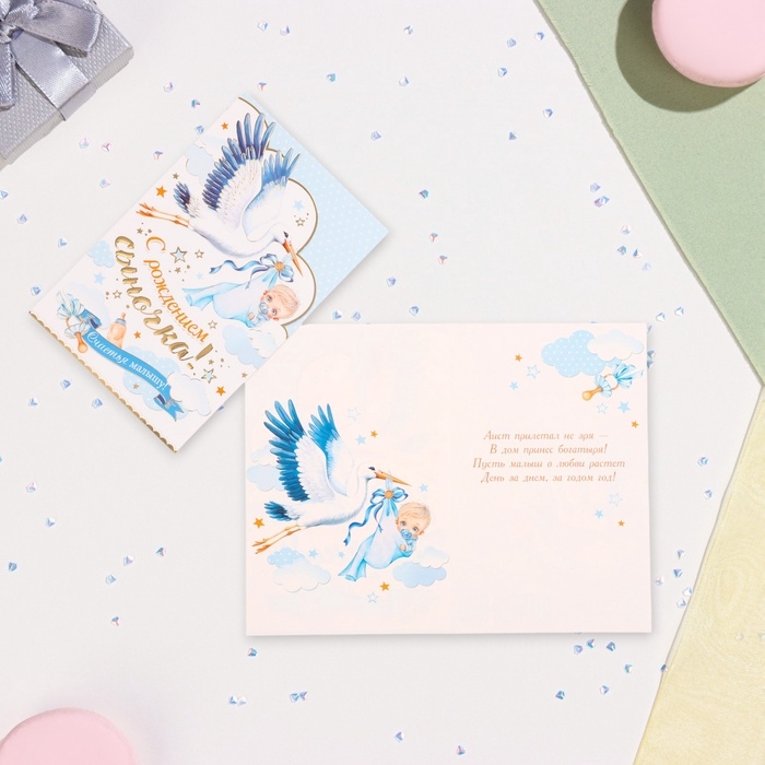 Открытка "С рождением сыночка!" конгрев, тиснение, аист, 12,5 х 19,4 см