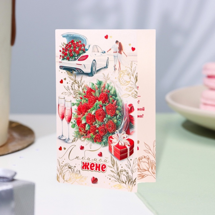 Открытка "Любимой жене!" конгрев, тиснение, красные розы, 12,5 х 19,4 см
