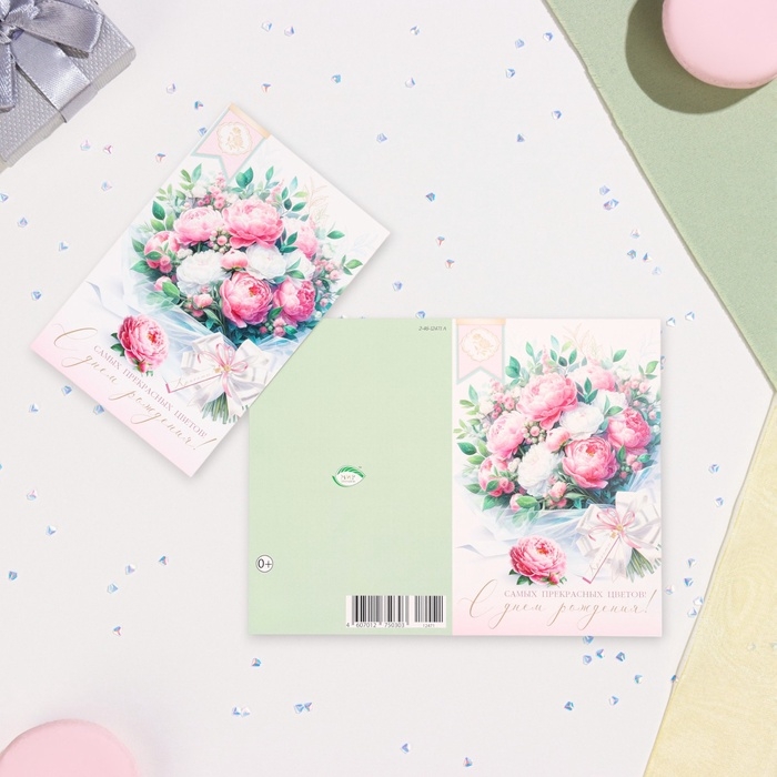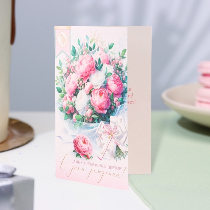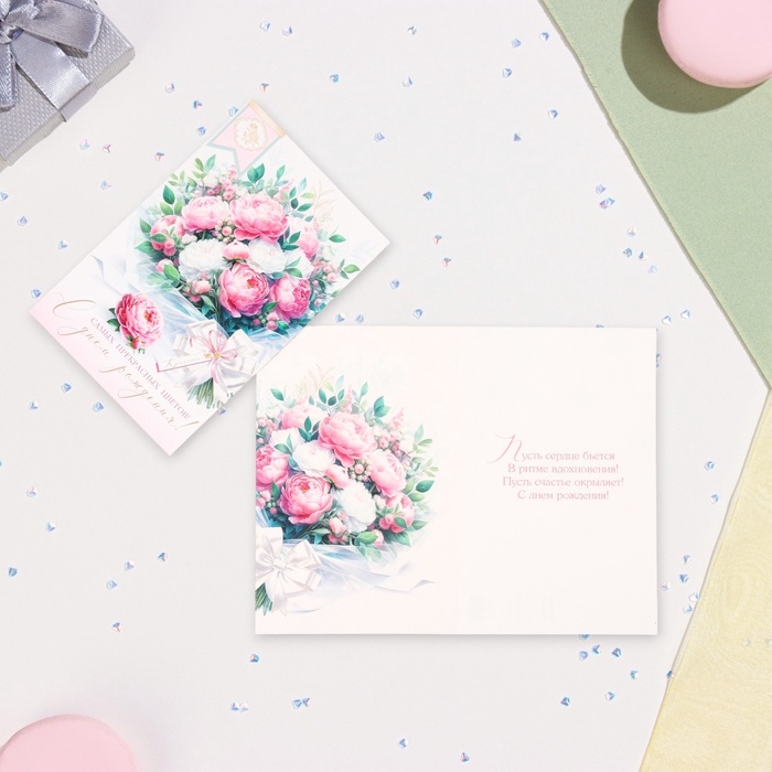 Открытка "С Днём Рождения!" глиттер, конгрев, букет с бантом, 12,5 х 19,4 см