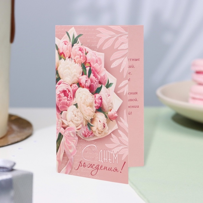 Открытка "С Днём Рождения!" глиттер, конгрев, розовый фон, букет, 12,5 х 19,4 см